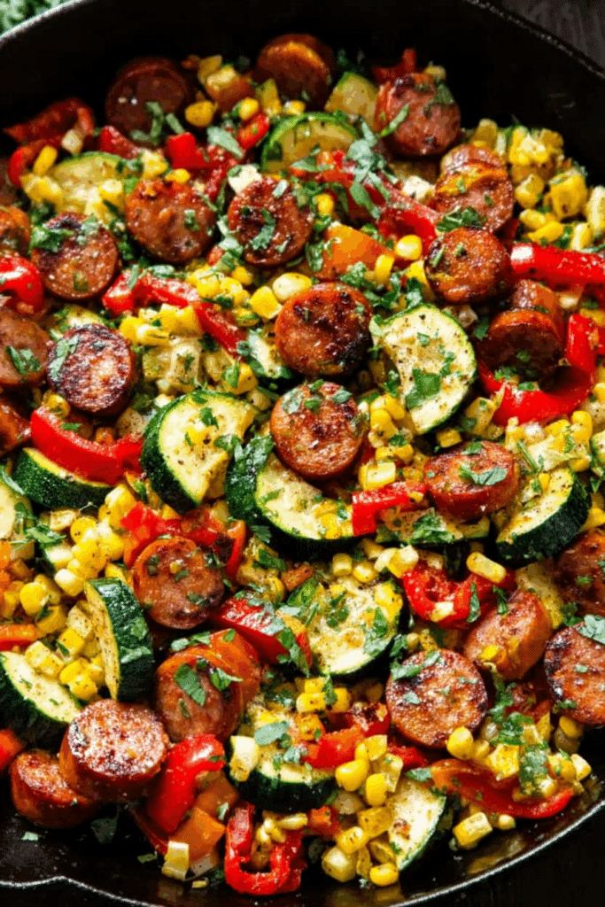 - Return the cooked sausage, bell pepper, and zucchini to the skillet. Add the corn kernels and mix well.