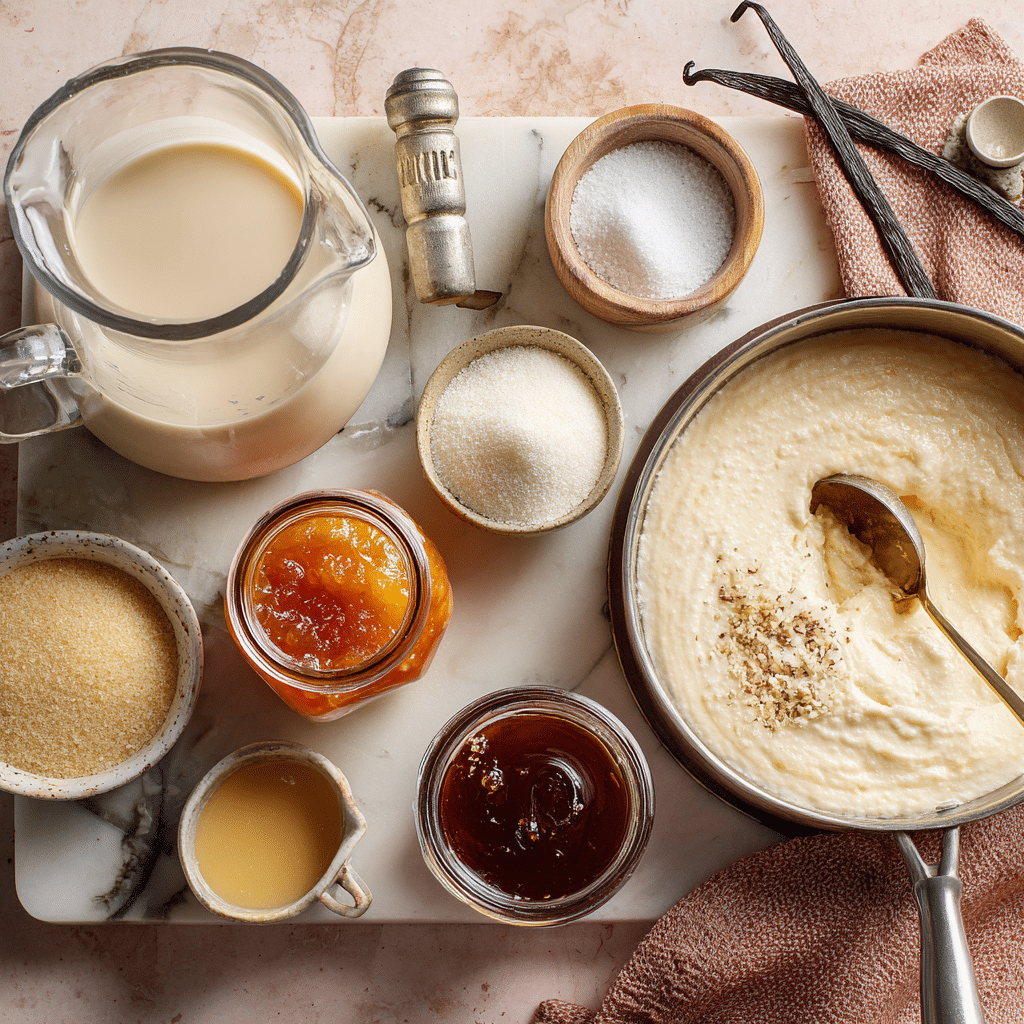 Half-and-half and whipping cream create a rich, velvety base that’s smoother than milk-based ice creams. The sugar is measured precisely to balance sweetness, while peach preserves add a unique, subtle fruitiness that enhances the vanilla. The vanilla bean, with its pulp and hull, delivers a deep, aromatic flavor that makes this ice cream “serious.” As the recipe notes, heating to the right temperature ensures a creamy texture without curdling.