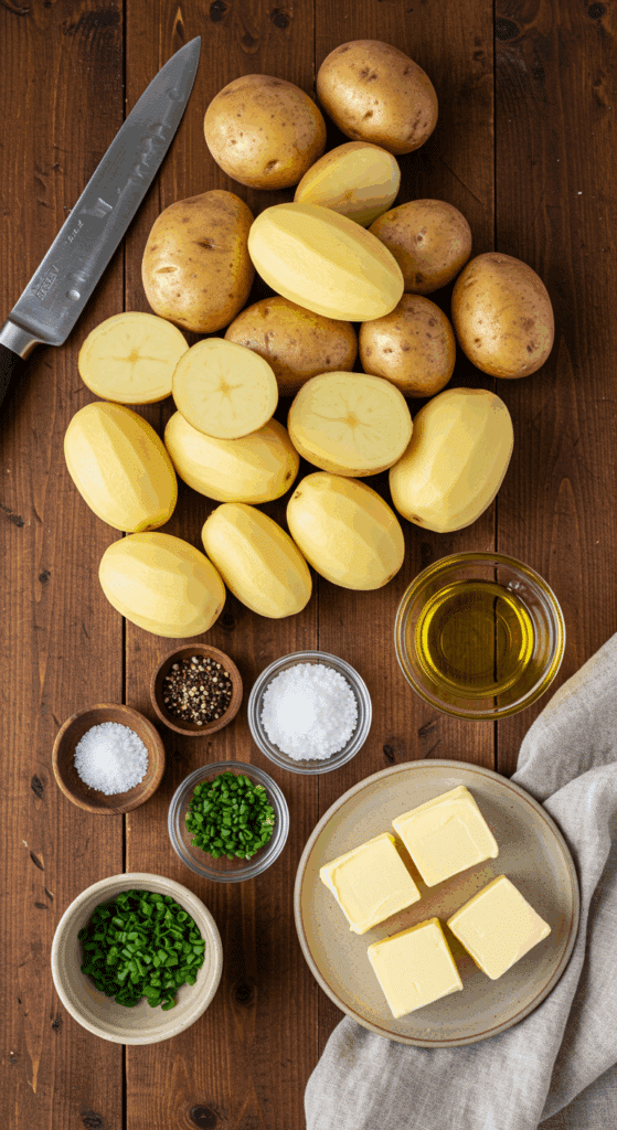 - Gather all ingredients: 5 pounds Yukon gold potatoes, kosher salt, black pepper, ⅓ cup vegetable oil, 4 tablespoons butter, and ¼ cup chopped chives.