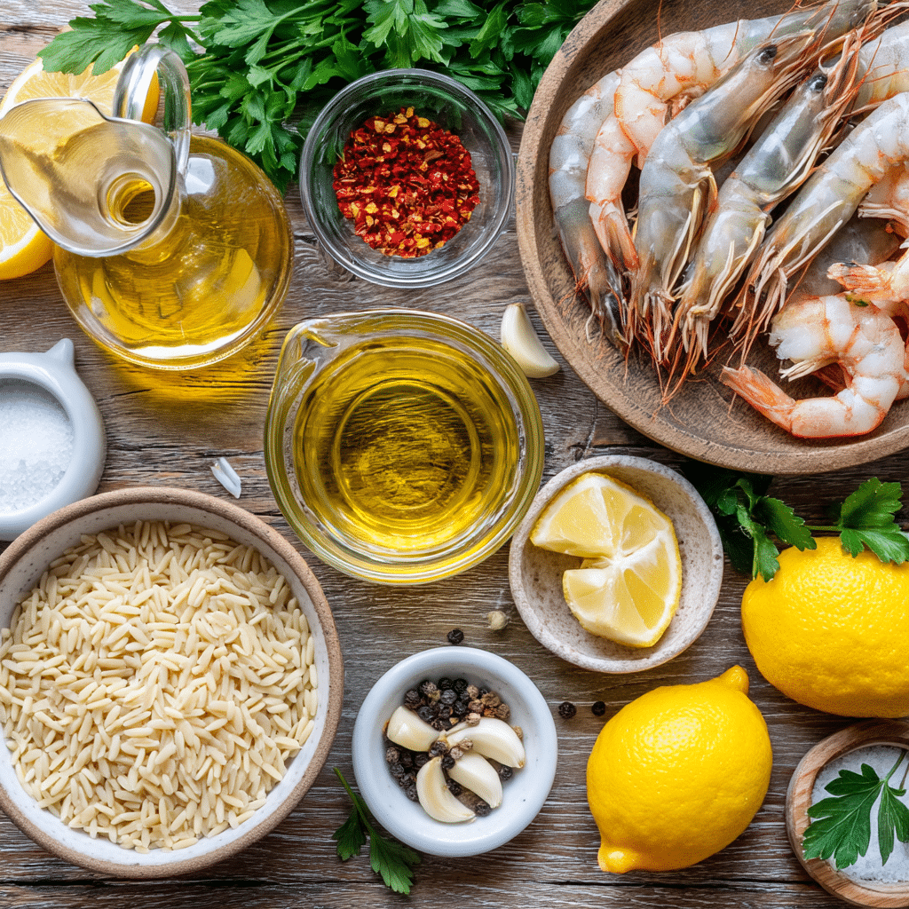 Why They’re Important: The shrimp deliver delicate, seafood sweetness, while orzo provides a tender, sauce-catching base. Garlic, lemon, and white wine create a zesty, aromatic sauce, and parsley adds freshness. Olive oil enhances richness, and red pepper flakes offer optional heat, making each bite a Mediterranean delight.