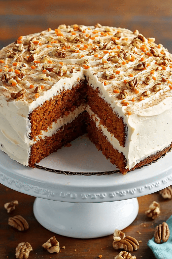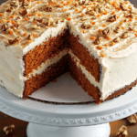Summary: This Carrot Cake is a classic dessert made with layers of moist, spiced carrot cake and a rich, tangy cream cheese frosting, topped with toasted pecans. It’s perfect for any special occasion.