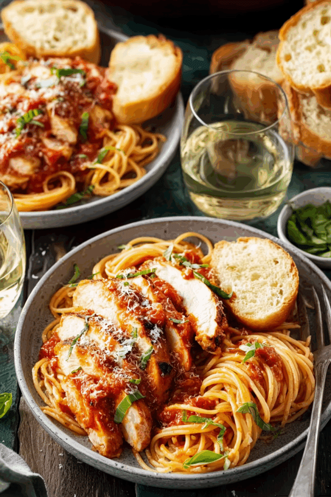 4. Serve: Plate chicken and sauce over pasta, topping with cheese and basil.