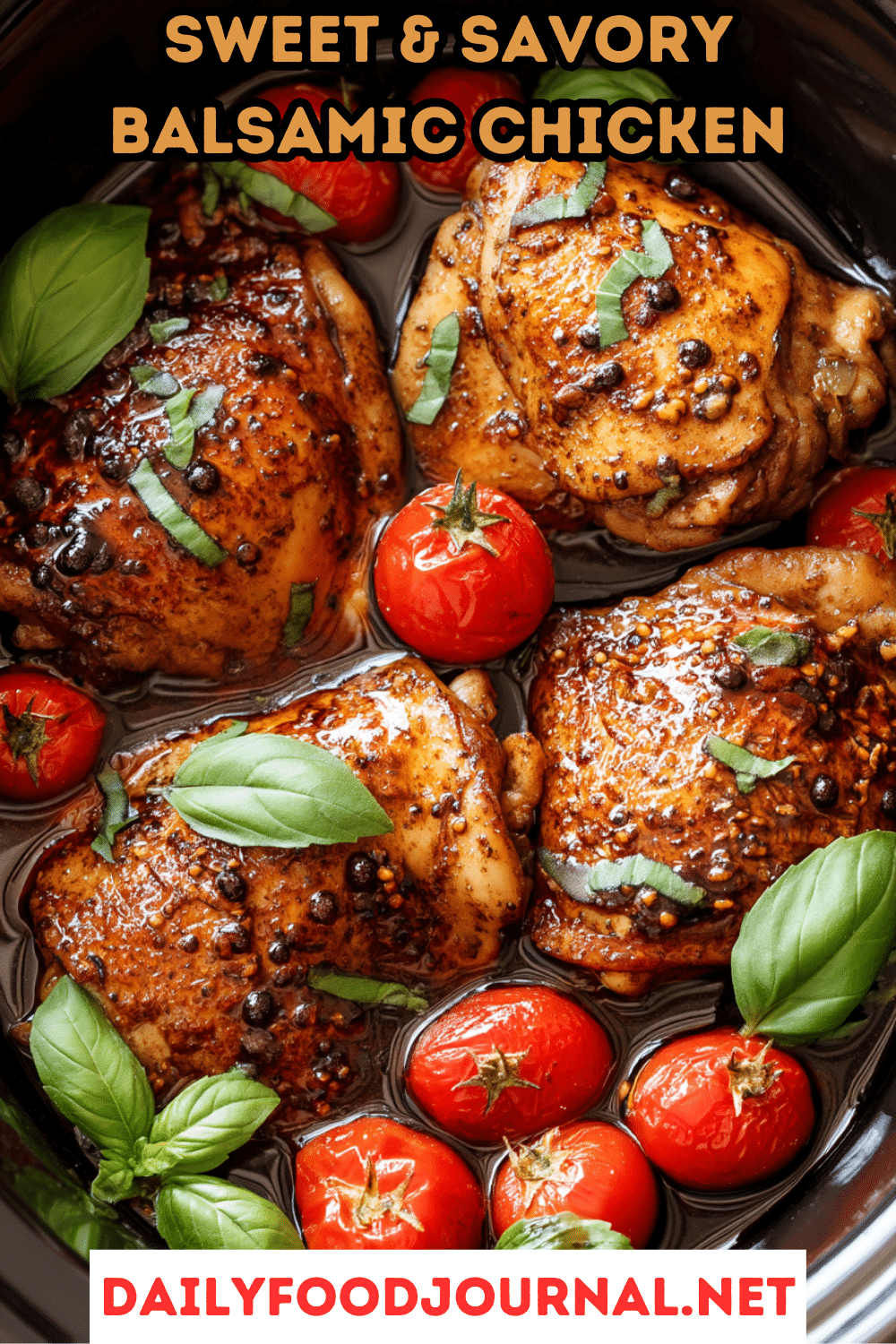 1. Remove the chicken from the slow cooker and place on plates, whole or sliced. Spoon the balsamic glaze and tomatoes generously over the top.
