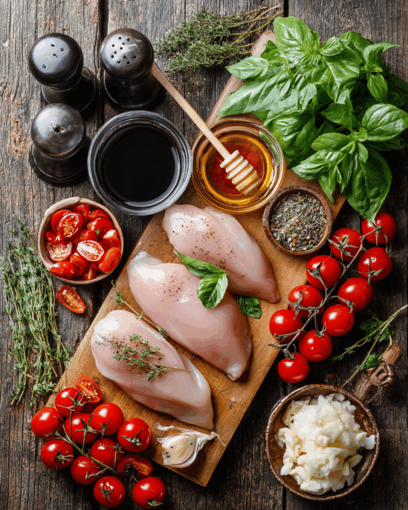 Why They’re Important: The chicken is the protein-packed base, balsamic vinegar and honey create the signature glaze, and garlic and thyme add savory depth. Cherry tomatoes bring freshness, and basil elevates the dish with a vibrant, Mediterranean touch.