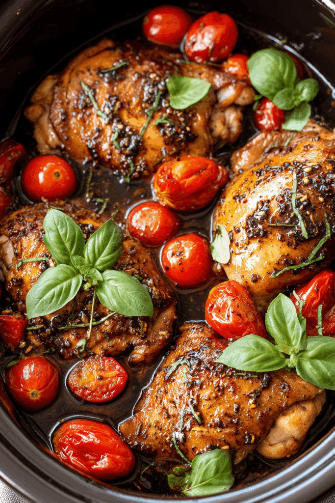 Making Slow Cooker Balsamic Glazed Chicken is incredibly simple—just mix the glaze, add the chicken and tomatoes, and let the slow cooker work its magic. Here’s how to do it: