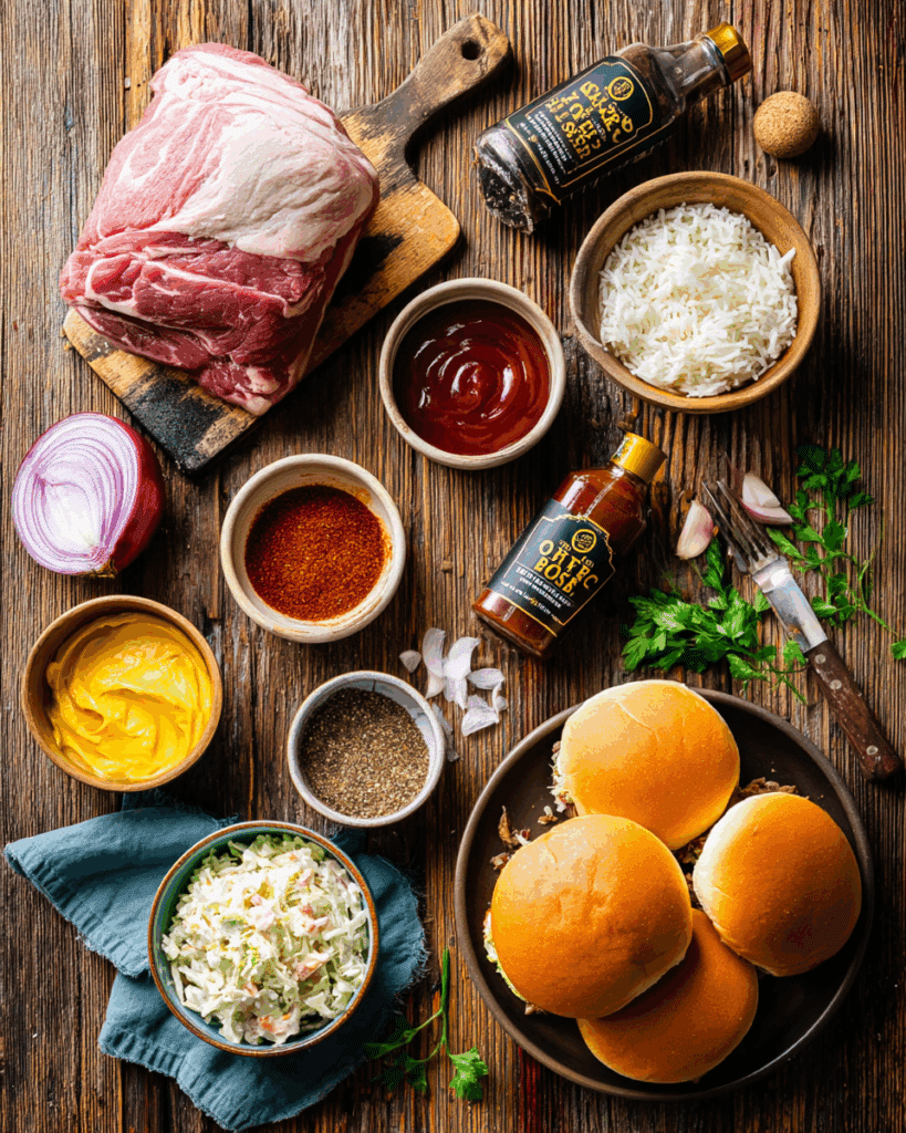 Why They’re Important: The pork shoulder is the juicy, flavorful star, BBQ sauce delivers the signature tang, and onions and garlic add depth. Spices enhance the smokiness, and buns or rice with coleslaw complete the dish with texture and balance.