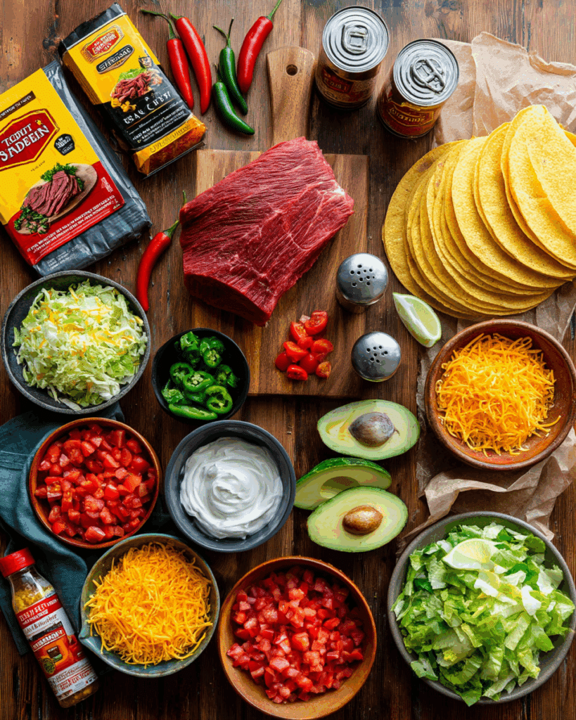 Why They’re Important: The beef chuck roast is the hearty, shreddable base, taco seasoning and tomatoes with green chilies deliver bold Mexican flavor, and broth ensures juiciness. Toppings add freshness, crunch, and creaminess, while shells or tortillas make it a complete, customizable meal.
