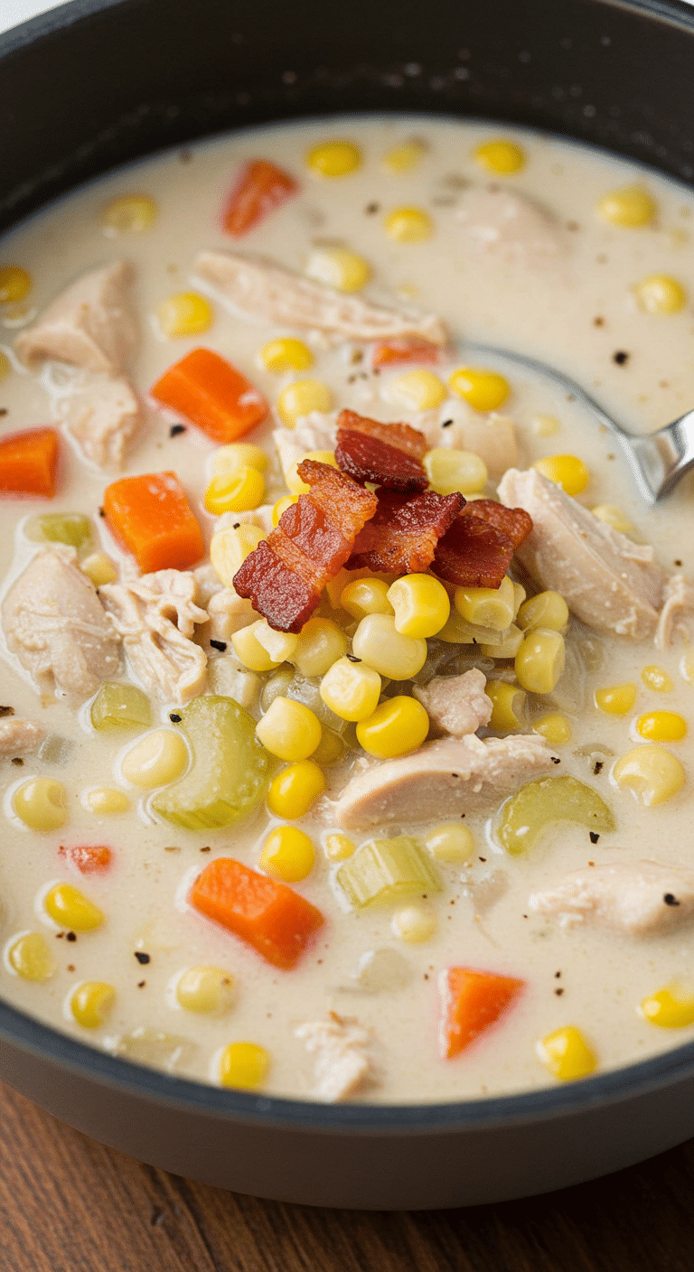 You’re now ready to master Slow Cooker Creamy Chicken & Corn Soup! This wholesome, comforting chowder brings tender chicken, sweet corn, and creamy sweet potatoes together for a meal that’s perfect for busy nights, family dinners, or meal prep. With minimal prep and a slow cooker, you can create a flavorful, nutrient-packed soup that’s as satisfying as it is easy. Play with vegetarian or spicy twists to make it your own. Grab that slow cooker, crumble some bacon, and enjoy this cozy delight. Share your results in the comments—I’d love to hear how it turned out!