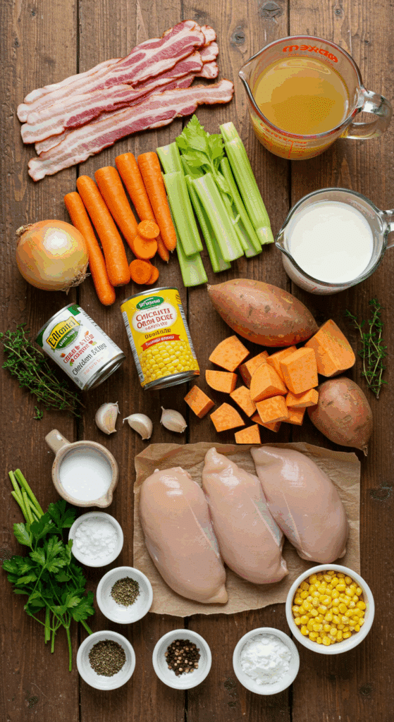 Health perks: Chicken provides lean protein and iron, while sweet potatoes and veggies offer fiber, vitamins A and C, and potassium. The moderate milk and bacon keep it balanced, and the recipe supports gluten-free or vegetarian diets with simple swaps.