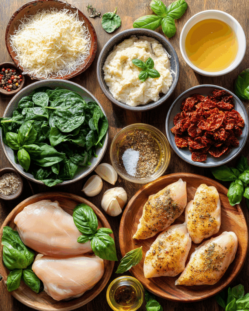 You’re starting with simple ingredients: chicken breasts, heavy cream, broth, garlic, sun-dried tomatoes, spinach, and Parmesan. Each one plays a role in building a sauce that’s full-bodied and deeply satisfying. The cream and cheese melt into the broth, thickening naturally into a luscious sauce that clings to the chicken and vegetables.