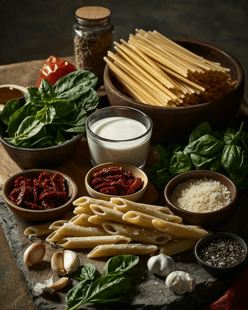 What makes this pasta so special is the texture and flavor. The pasta cooks slowly, soaking up the broth and cream while releasing starch to thicken the sauce naturally. The sun-dried tomatoes add bursts of sweet and savory flavor, while the spinach and basil keep everything feeling fresh.