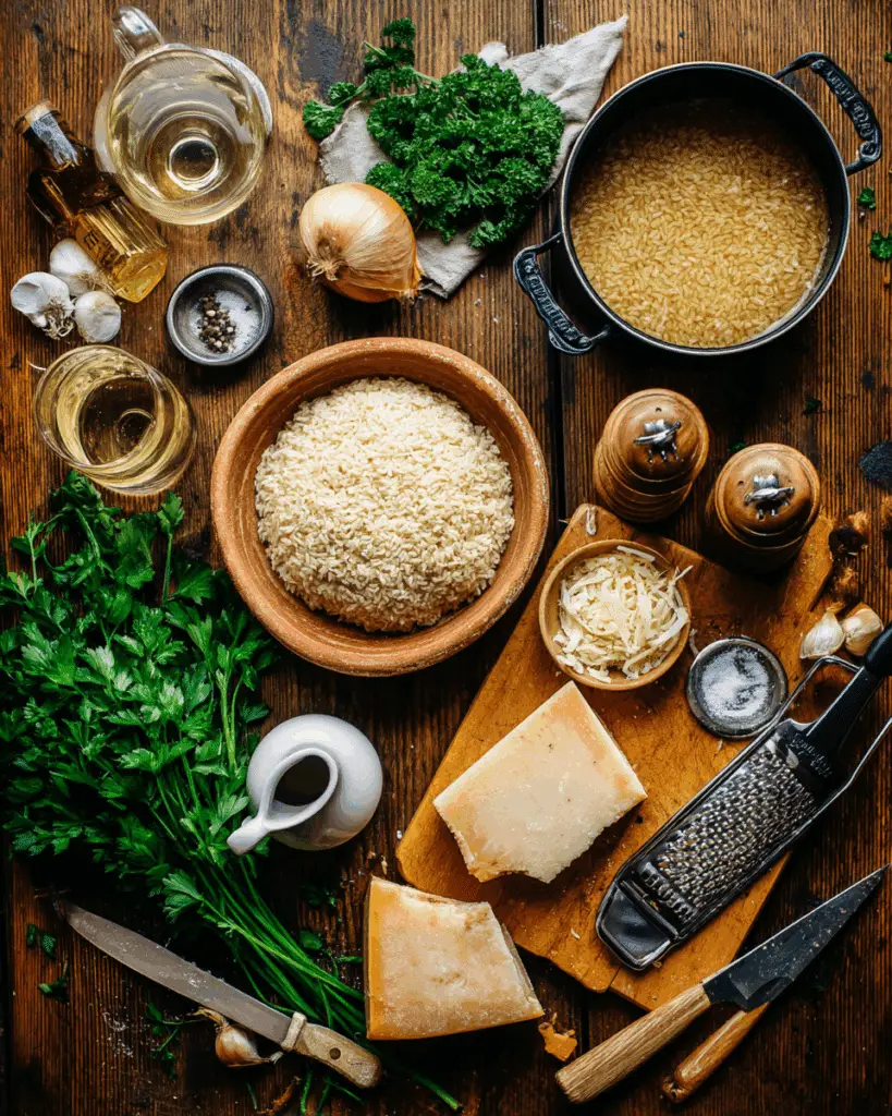 Why They’re Important: Arborio rice is the creamy foundation, broth and wine build the flavor base, and garlic and Parmesan deliver bold, savory notes. Cream enhances the texture, and parsley adds a fresh, colorful touch.