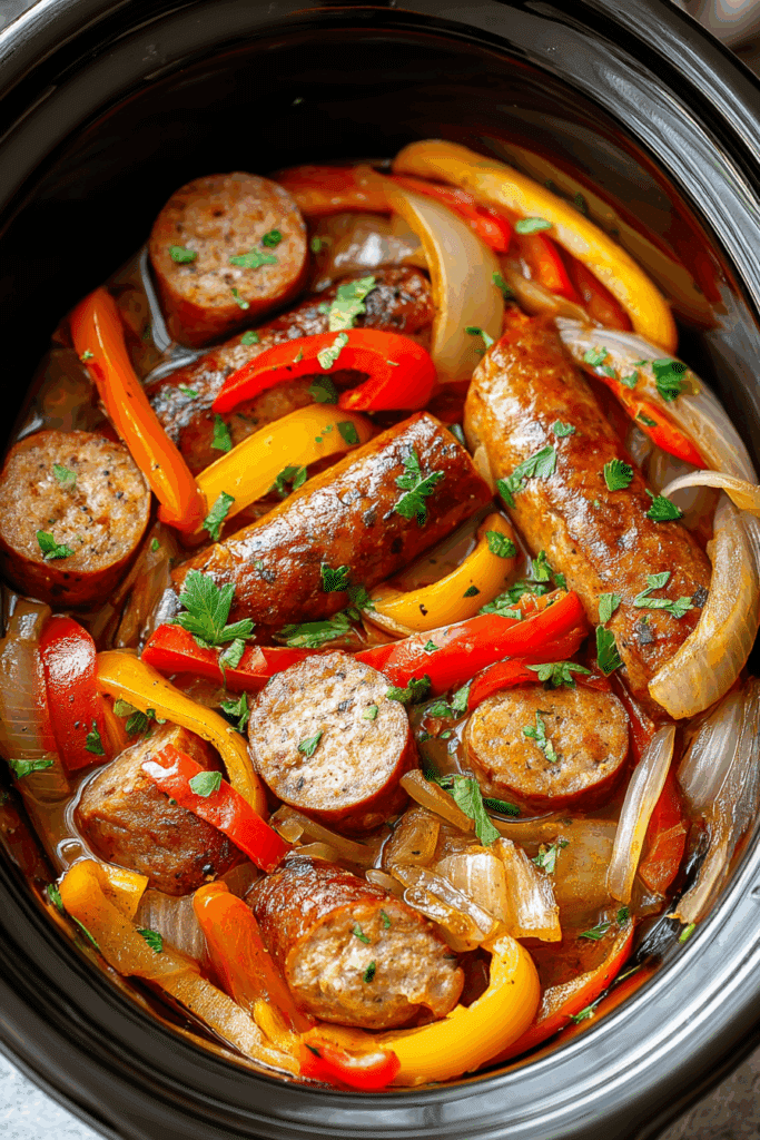 Cover and cook on low for 6-7 hours or high for 3-4 hours, until the sausages are cooked through (internal temperature of 160°F/71°C for pork) and the vegetables are tender.