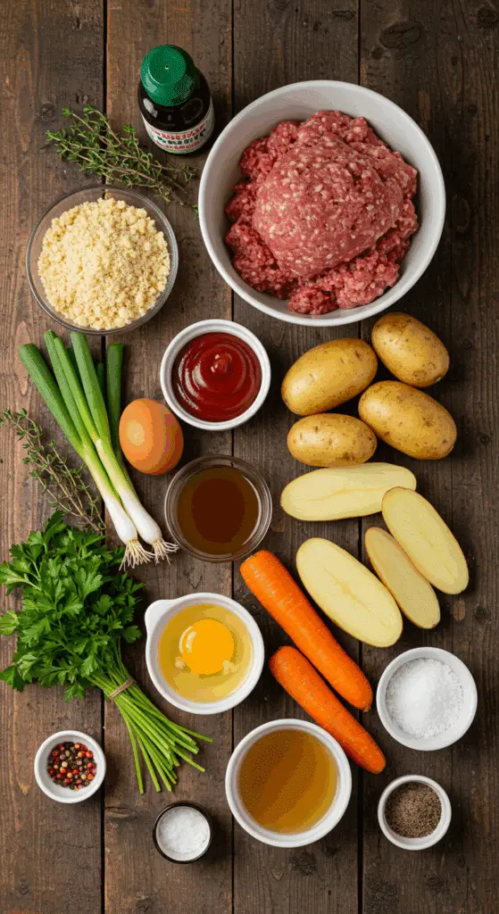 - Gather all ingredients: 2 ¼ pounds meatloaf mix, 1 cup panko, 2 eggs, 1 ¼ cups ketchup, 2 tablespoons Worcestershire, 4 scallions, 2 tablespoons parsley, 2 teaspoons thyme, salt, pepper, 12 ounces fingerling potatoes, 3 carrots, ¼ cup chicken broth, 2 tablespoons brown sugar.