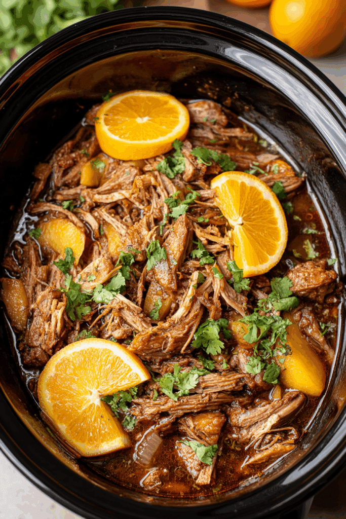 • Vegetarian: Swap pork for jackfruit or portobello mushrooms, cooking for 4-5 hours on low, and use vegetable broth instead of juice.