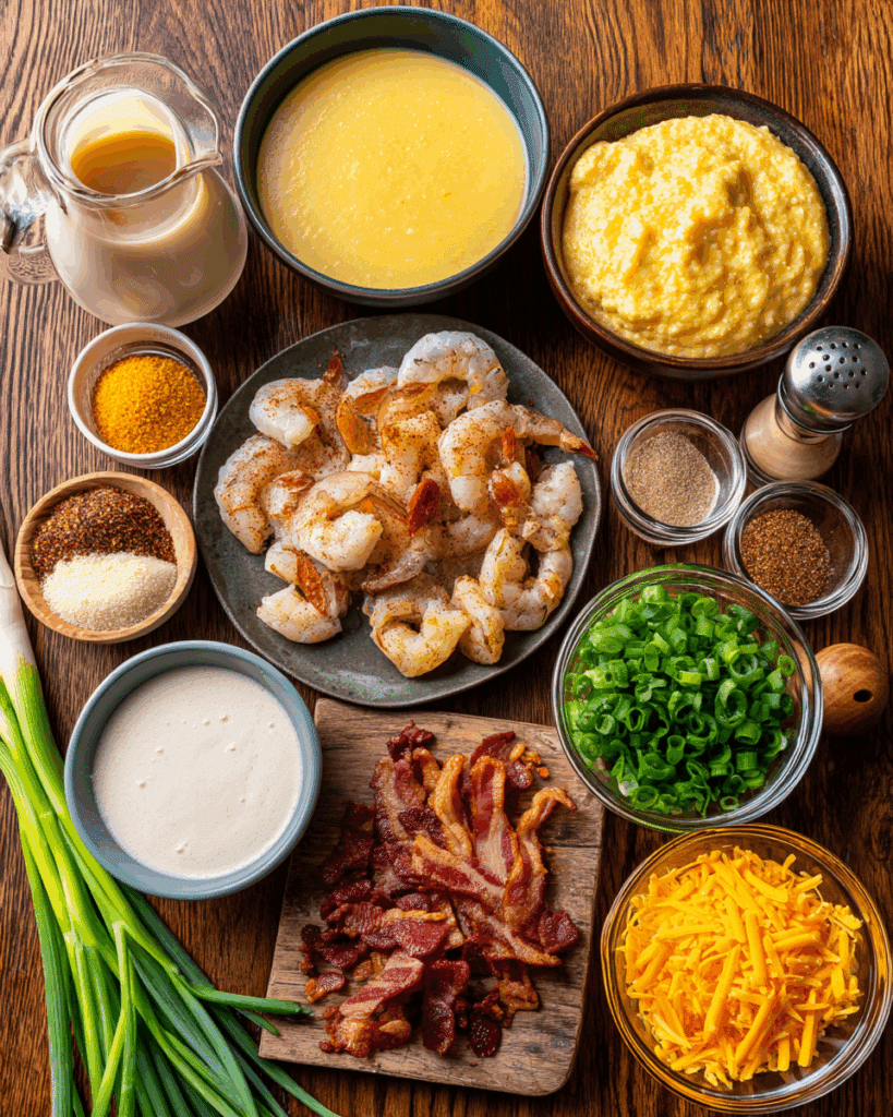 Why They’re Important: The shrimp provide a delicate, protein-rich topping, grits create a creamy canvas, and bacon and cheese add indulgent depth. Cajun seasoning brings Southern flair, while green onions elevate the dish with freshness and vibrancy.