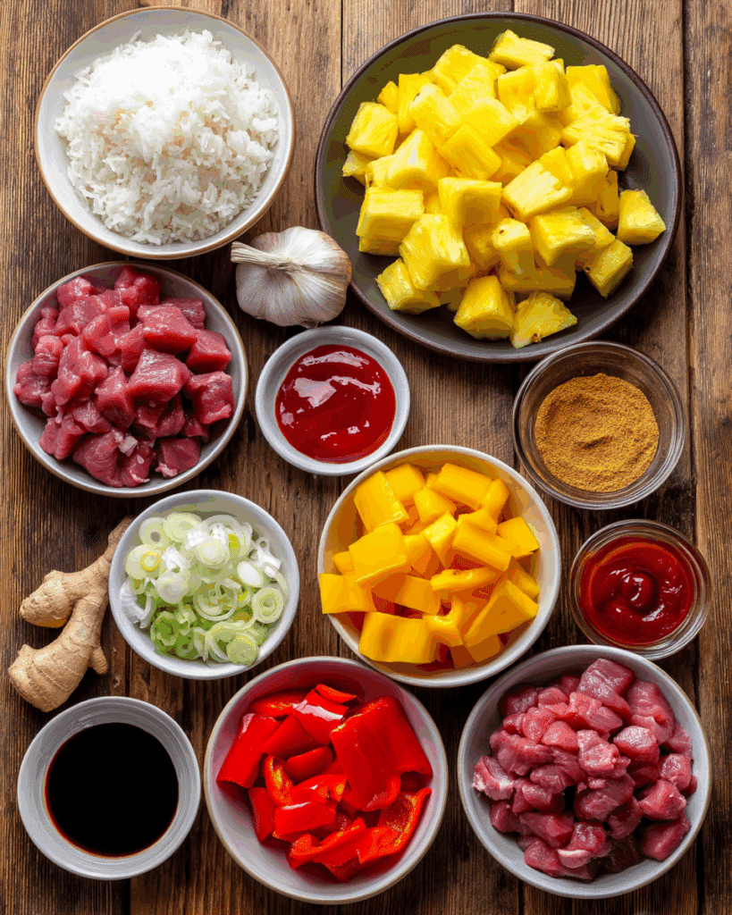Why They’re Important: The pork is the hearty base, pineapple and bell peppers add vibrant texture, and the sauce ingredients (soy sauce, ketchup, brown sugar) create the signature sweet-and-sour flavor. Garlic and ginger elevate the dish with aromatic depth, and rice completes it as a satisfying meal.