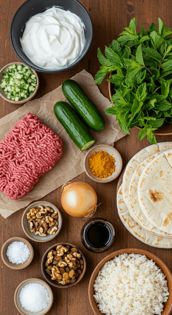 • Gather all ingredients: 2 cups Greek yogurt, 2 mini cucumbers, 3 tablespoons chopped mint, 1 garlic clove, 1 pound ground beef, 1 small onion, ½ teaspoon turmeric, 2 teaspoons kosher salt, black pepper, ¼ cup walnuts, 2 tablespoons raisins, pomegranate molasses (optional), pita or rice.
