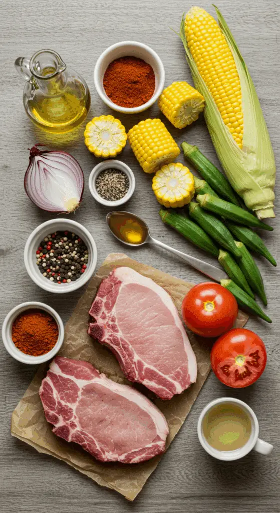 What are the health benefits? Pork provides protein and B vitamins for energy. Corn and okra offer fiber and vitamins A and C, and tomatoes add heart-healthy lycopene. It’s a balanced meal with minimal added sugar.
