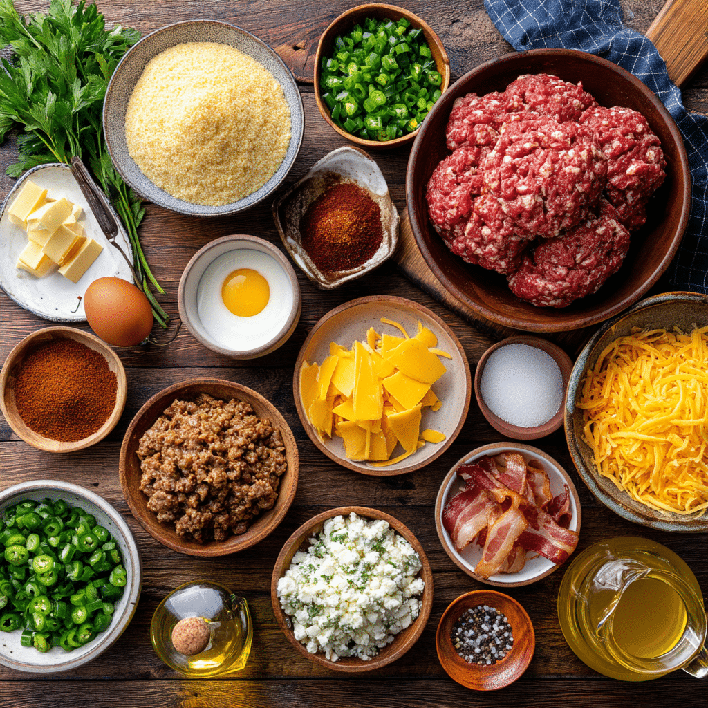 Why They’re Important: Ground beef forms the hearty base, while jalapeños, cream cheese, cheddar, and bacon create the jalapeño popper-inspired filling with smoky, spicy, and creamy notes. Smoked paprika and Worcestershire sauce add depth, breadcrumbs and egg ensure structure, and the ranch drizzle provides a tangy, cooling contrast. Garnishes elevate the dish with a fresh, polished finish.