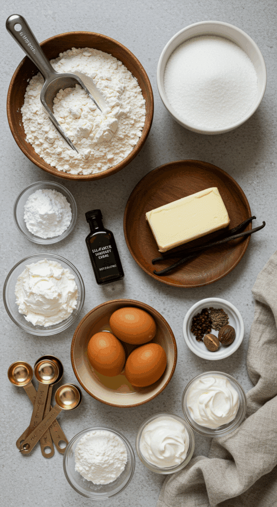- Gather 3 cups all-purpose flour, ½ teaspoon salt, ¼ teaspoon baking soda, 3 cups white sugar, 1 cup softened unsalted butter, 6 large eggs, 1 tablespoon vanilla extract, ⅛ teaspoon ground mace or ¼ teaspoon ground nutmeg, 1 cup sour cream, and confectioners’ sugar for dusting.