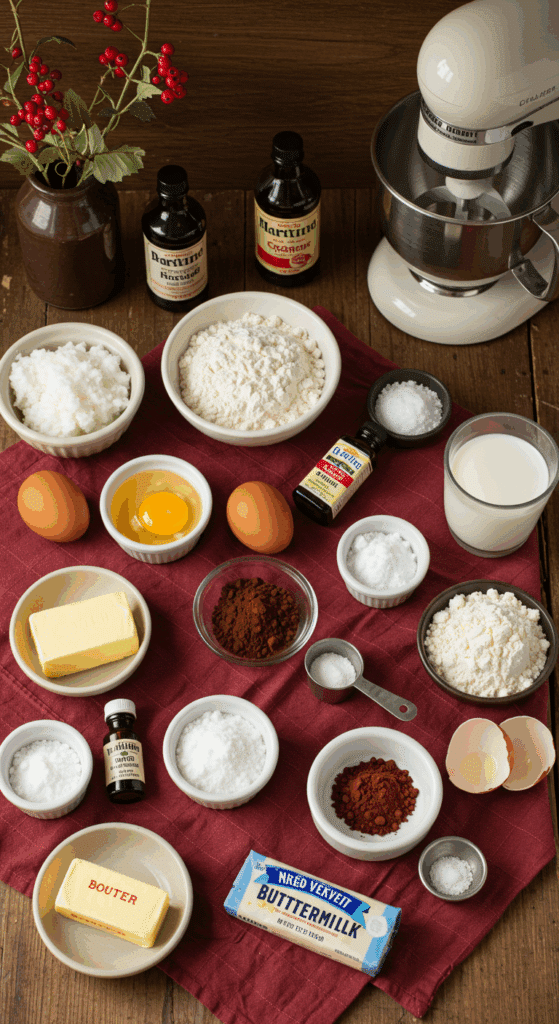 - Red Food Coloring and Cocoa: Define the cake’s iconic color and subtle chocolate flavor.