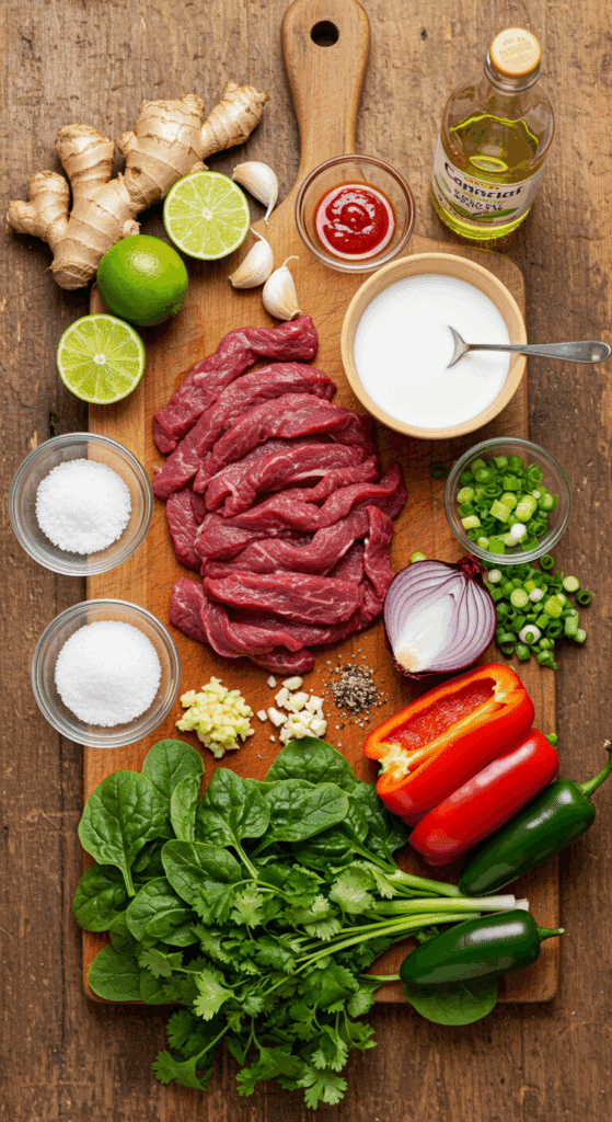 Why These Ingredients Matter: The lean beef and spinach pack protein and iron, while the veggies add fiber and vitamins. The coconut-lime sauce with Sriracha brings a bold, balanced flavor that’s healthy and indulgent at the same time.
