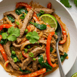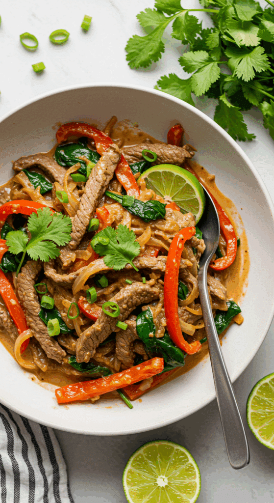 This dish is loaded with lean protein from beef, iron and vitamins from spinach, and fiber from veggies. The light coconut milk keeps it lower in fat, and the lime adds vitamin C. It’s a balanced meal that’s filling and nutritious.