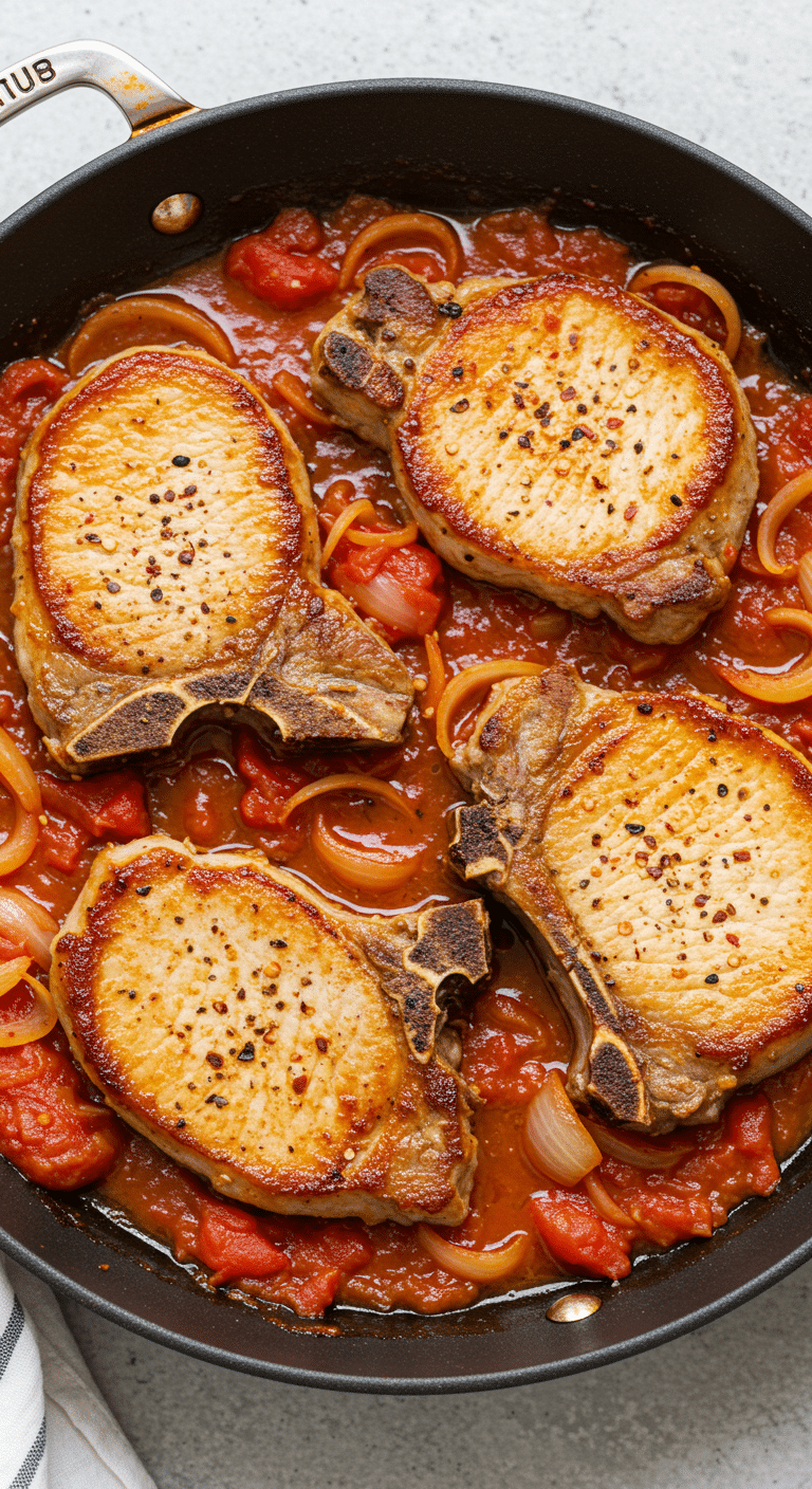 The Spicy Tomato Pork Chops are a fast, flavorful dish that combines tender pork chops with a vibrant, mildly spicy tomato sauce infused with onions and warm spices. It’s comforting, versatile, and comes together quickly. Here’s why it’s a standout: