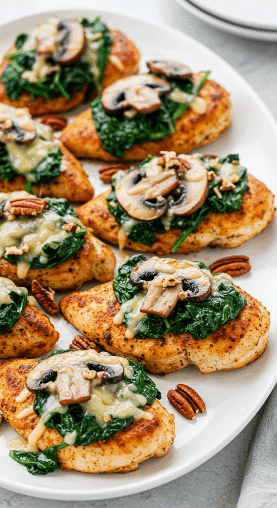 Why These Ingredients Matter: The chicken and cheese provide lean protein and calcium, while the spinach and mushrooms add fiber, vitamins, and antioxidants. The pecans offer healthy fats and crunch, making this a balanced, low-carb meal that’s both satisfying and nutritious.