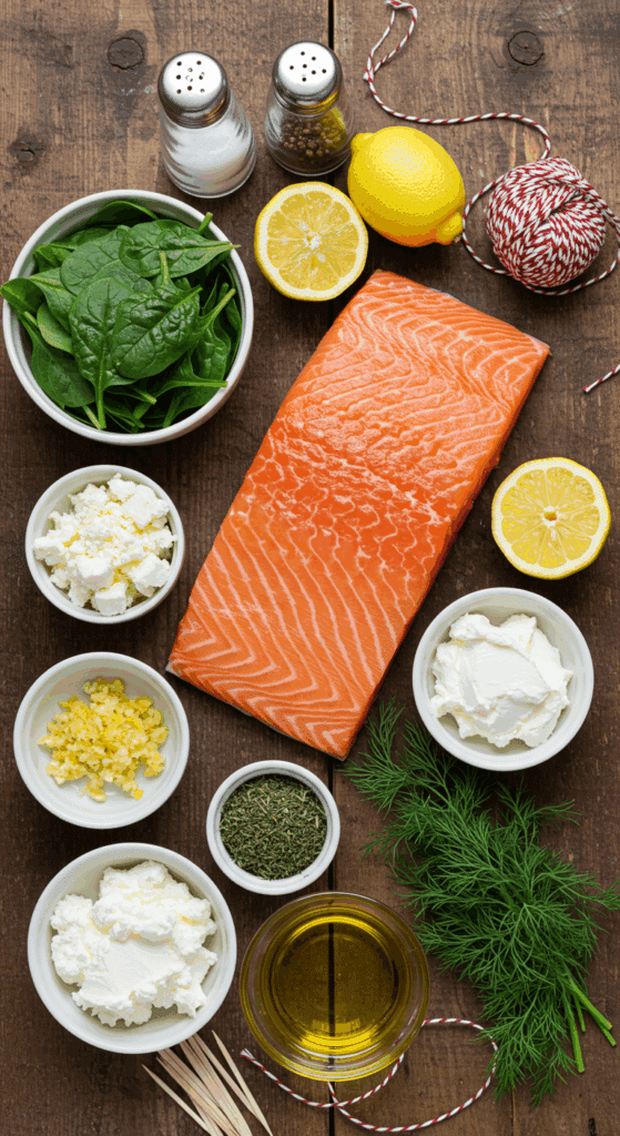 Here’s what you need to make these Spinach & Feta Stuffed Salmon Pinwheels. Each ingredient adds to the savory, creamy, and zesty magic.