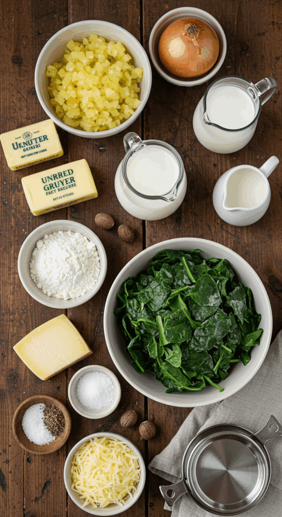 • Gather all ingredients: 4 tablespoons butter, 4 cups chopped yellow onions, ¼ cup flour, ¼ teaspoon nutmeg, 1 cup heavy cream, 2 cups milk, 3 pounds frozen spinach (defrosted), 1 cup Parmesan, 1 tablespoon kosher salt, ½ teaspoon black pepper, ½ cup Gruyere.