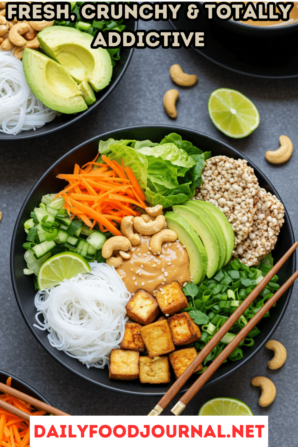 Craving a light, vibrant meal that captures the essence of spring rolls without the wrapping? These Spring Roll Bowls are your perfect choice! Featuring tender sesame-seared chicken, rice stick noodles, crisp Boston lettuce, grated carrots, avocado, scallions, mint, cashews, sesame crackers, and a rich peanut sauce, this bowl is a delightful mix of fresh, nutty, and savory flavors