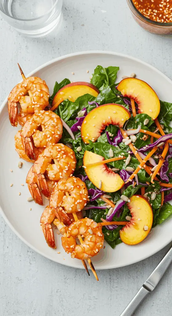 Sriracha Shrimp Skewers with Collard-Peach Salad