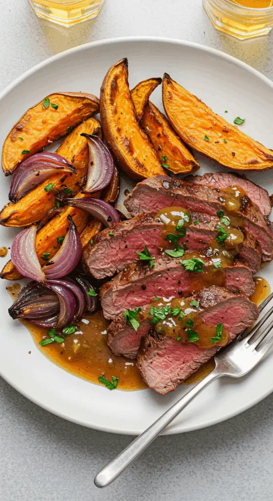 What makes Steak with Beer Sauce and Sweet Potatoes so special? It’s a balanced, flavorful meal that combines perfectly seared sirloin steaks with a unique lager-based sauce that’s tangy and slightly sweet, thanks to mustard, honey, and apple cider vinegar. Roasted sweet potatoes and red onion add a caramelized, hearty side that complements the bold beef. This dish is fast, versatile, and ideal for family dinners, date nights, or fall evenings, with minimal cleanup and maximum flavor.
