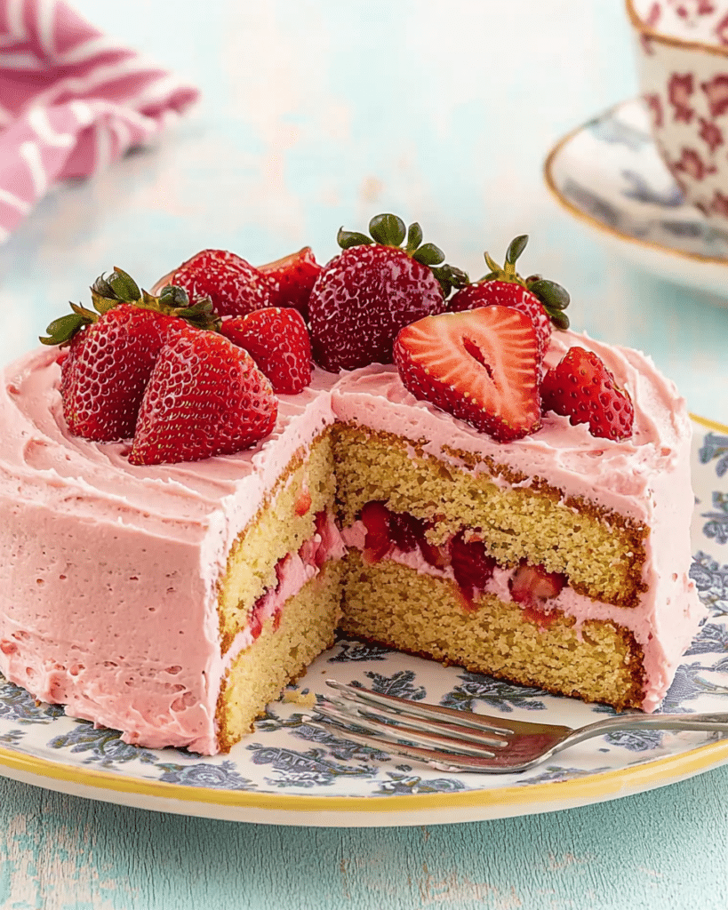 Serve with more sliced strawberries, if desired. Enjoy your simple and delicious Strawberry Cake!