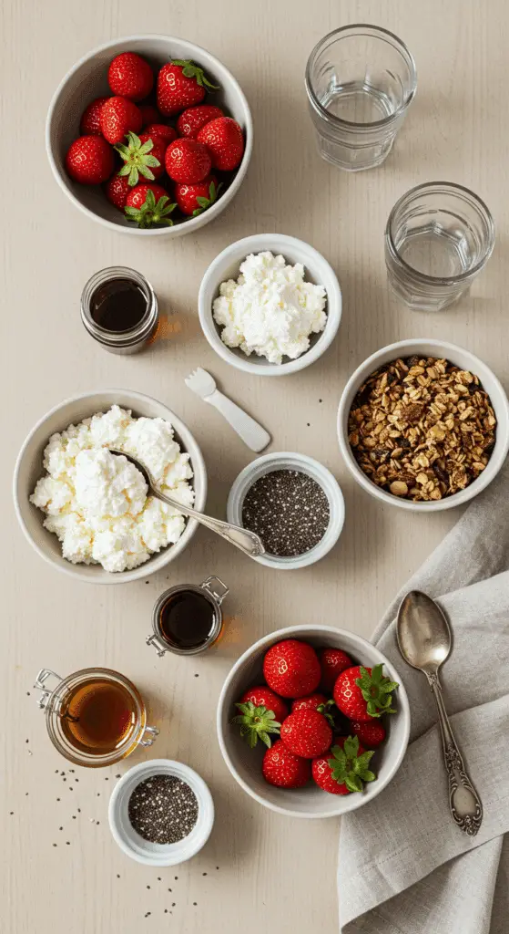 - Gather all ingredients: 1 cup cottage cheese, 2 tablespoons chia seeds (optional), 2-3 tablespoons maple syrup, 1 teaspoon vanilla extract, 1 cup fresh strawberries, and ¼ cup granola.