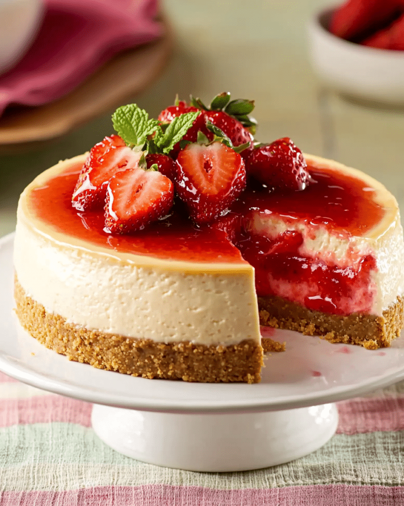 Summary: This Strawberry Cheesecake features a classic graham cracker crust, a creamy, tangy cream cheese filling, and a vibrant, fresh strawberry topping. It’s a show-stopping dessert that’s perfect for any special occasion.