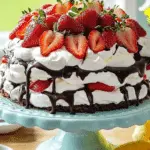 Summary: This dessert features two crisp, sweet 8-inch meringue discs layered with melted chocolate, fresh macerated strawberries, and homemade whipped cream. It’s an elegant, naturally gluten-free torte with delightful textural contrasts.