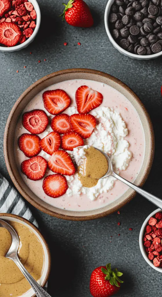 - Garnish with fresh strawberry slices, a drizzle of almond butter, or a sprinkle of freeze-dried strawberries for a vibrant look.