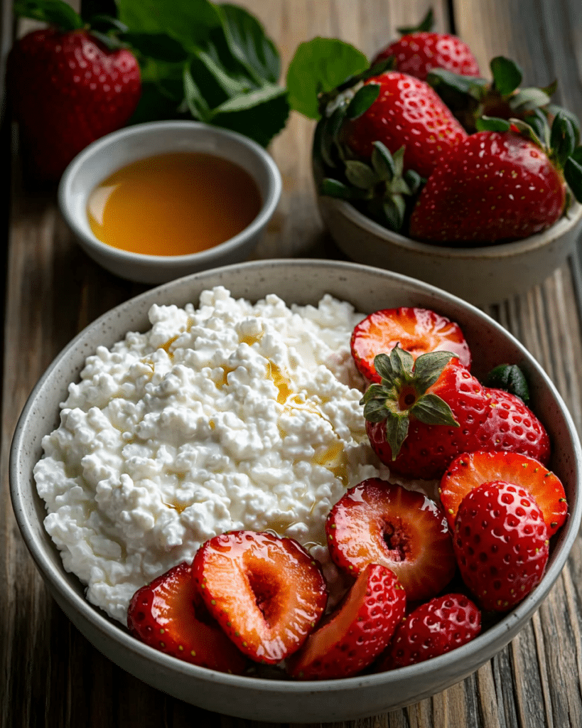 The cottage cheese gives it a creamy, slightly tangy base that pairs perfectly with the natural sweetness of strawberries and honey.