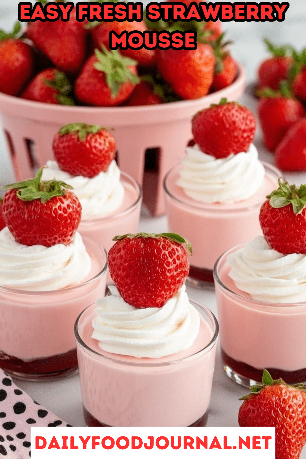 - Just before serving, top each mousse with a dollop of whipped cream and garnish with fresh strawberry slices or whole berries.