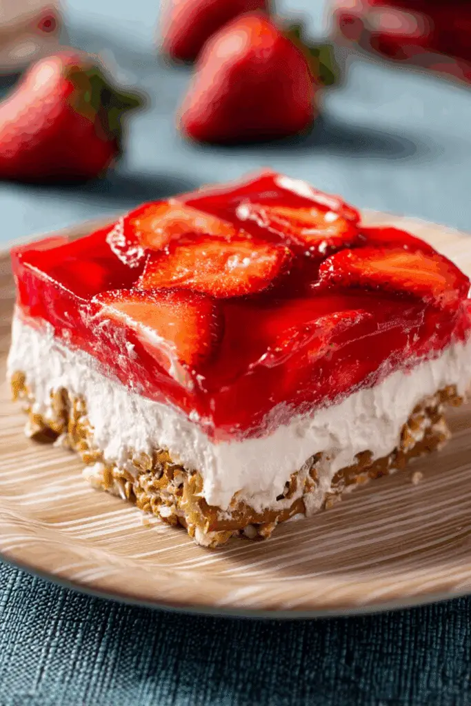 This dish is technically called a salad, but let’s be honest—it’s absolutely dessert. The combination of a salty-sweet pretzel base, fluffy cream cheese filling, and a vibrant strawberry Jello topping makes it one of the most unforgettable layered desserts out there.