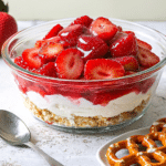Summary: This Strawberry Pretzel Salad is a layered dessert that features a salty pretzel crust, a creamy cheesecake-like filling, and a sweet-tart strawberry topping made with gelatin and fresh strawberries. It’s a no-bake dessert that’s perfect for any occasion.