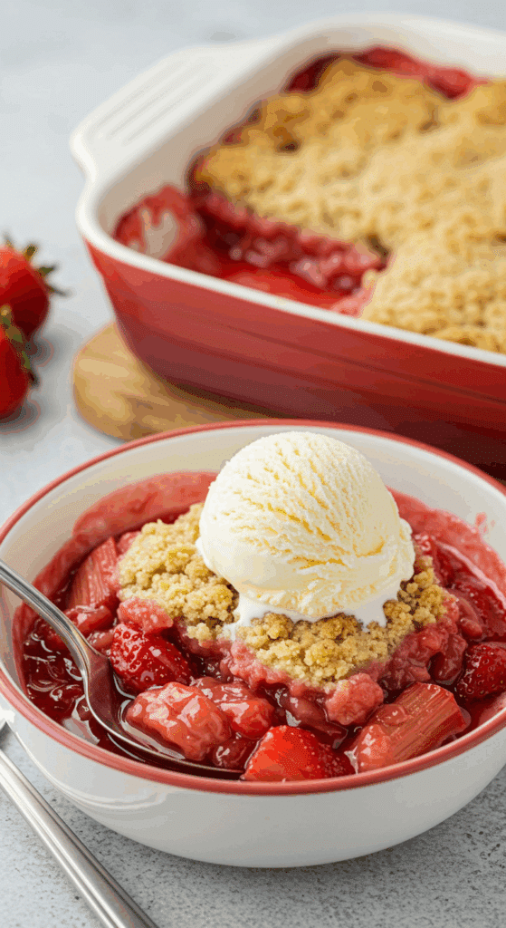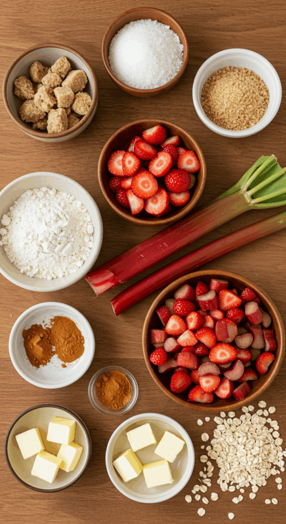Why These Ingredients Matter: The rhubarb and strawberries create a tart-sweet filling, thickened by flour to prevent runniness. The oats, brown sugar, and butter form a crunchy, golden topping, with cinnamon adding warmth to tie it all together.