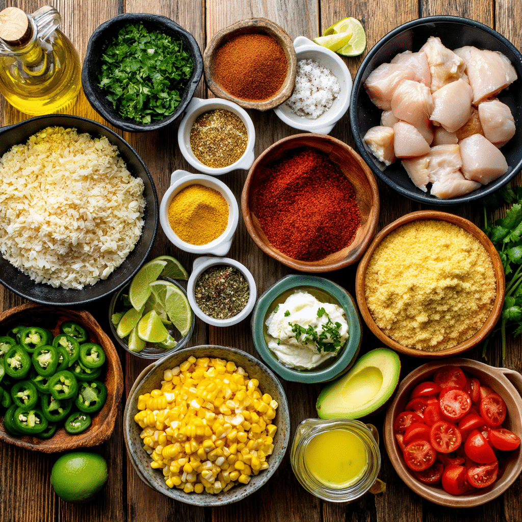 The magic of Slow Cooker Street Corn Chicken Rice Bowl comes from its vibrant, textured ingredients. Each one adds smokiness, creaminess, or zest to create a cohesive, street food-inspired dish. Here’s what you’ll need: