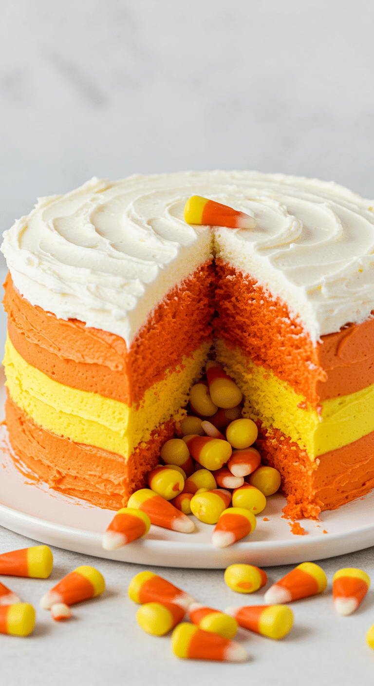 - Chocolate Candy Corn Cake: Use a chocolate cake mix and add chocolate chips to the filling.