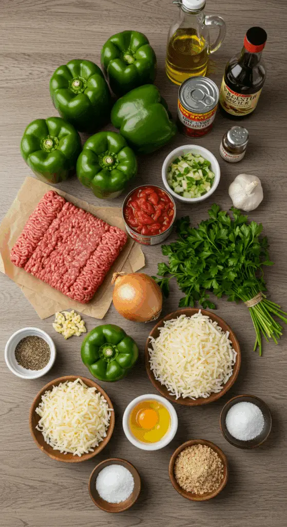 - Gather all ingredients: 6 green bell peppers, 2 tablespoons vegetable oil, 1 onion, kosher salt, 1 pound ground beef, 2 cloves garlic, black pepper, 28-ounce can fire-roasted tomatoes, 2 cups cooked rice, 1 cup parsley, 1 ½ cups mozzarella, ½ cup breadcrumbs, 2 eggs, 4 teaspoons Worcestershire sauce.