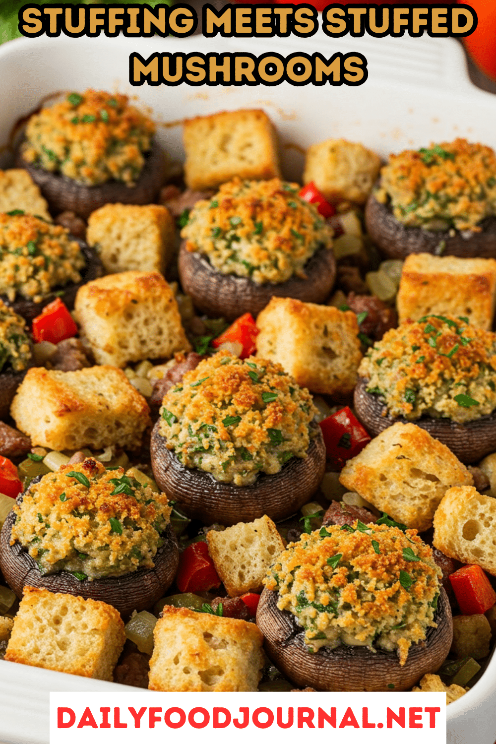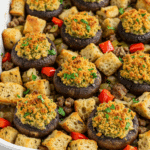 Craving a unique twist on a Thanksgiving classic that mushroom lovers will adore? Stuffed Mushroom Stuffing combines the savory flavors of stuffed mushrooms—sausage, bell pepper, scallions, and herbs—with a juicy, buttery bread stuffing, topped with individual stuffed mushroom caps for a stunning presentation.