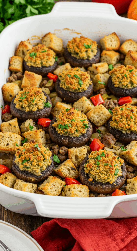 • Why It’s Special: Combines classic stuffing with stuffed mushroom flavors, featuring sausage, vegetables, and herbs, topped with panko-crusted mushroom caps for texture and flair. This recipe serves 12, ideal for a crowd.